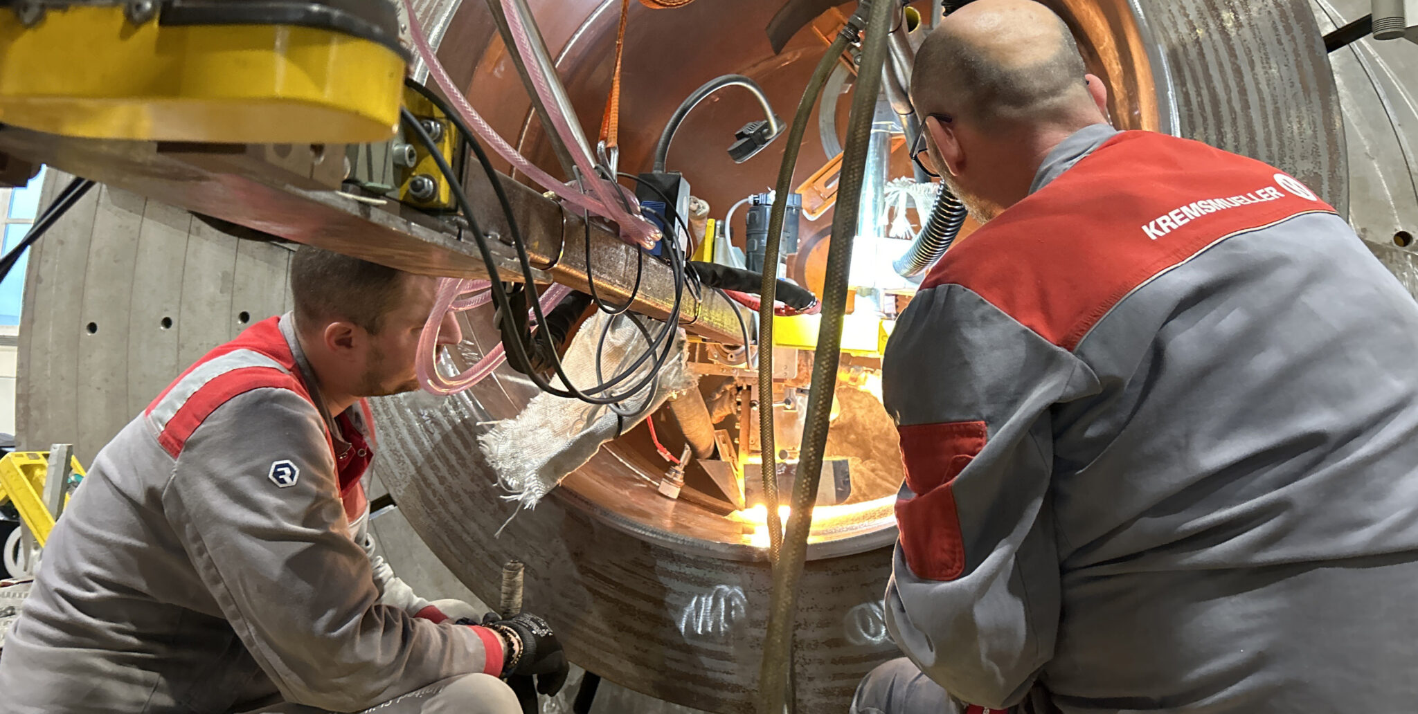 Eine zentrale Anforderung war, zum Korrosionsschutz eine Edelstahlschicht auf den Flanschen und Mantelinnenseiten der Bauteile aufzutragen. „In der Planungsphase stellte sich heraus, dass ESW aufgrund seiner Kosteneffizienz die beste Lösung ist, da damit etwa dreimal weniger Kosten anfallen“, so Projektleiter Alois W. Dieses Verfahren befindet sich bei Kremsmüller seit etwa 10 Jahren im Leistungsportfolio und kam nun erstmals in diesen Dimensionen erfolgreich zur Anwendung.