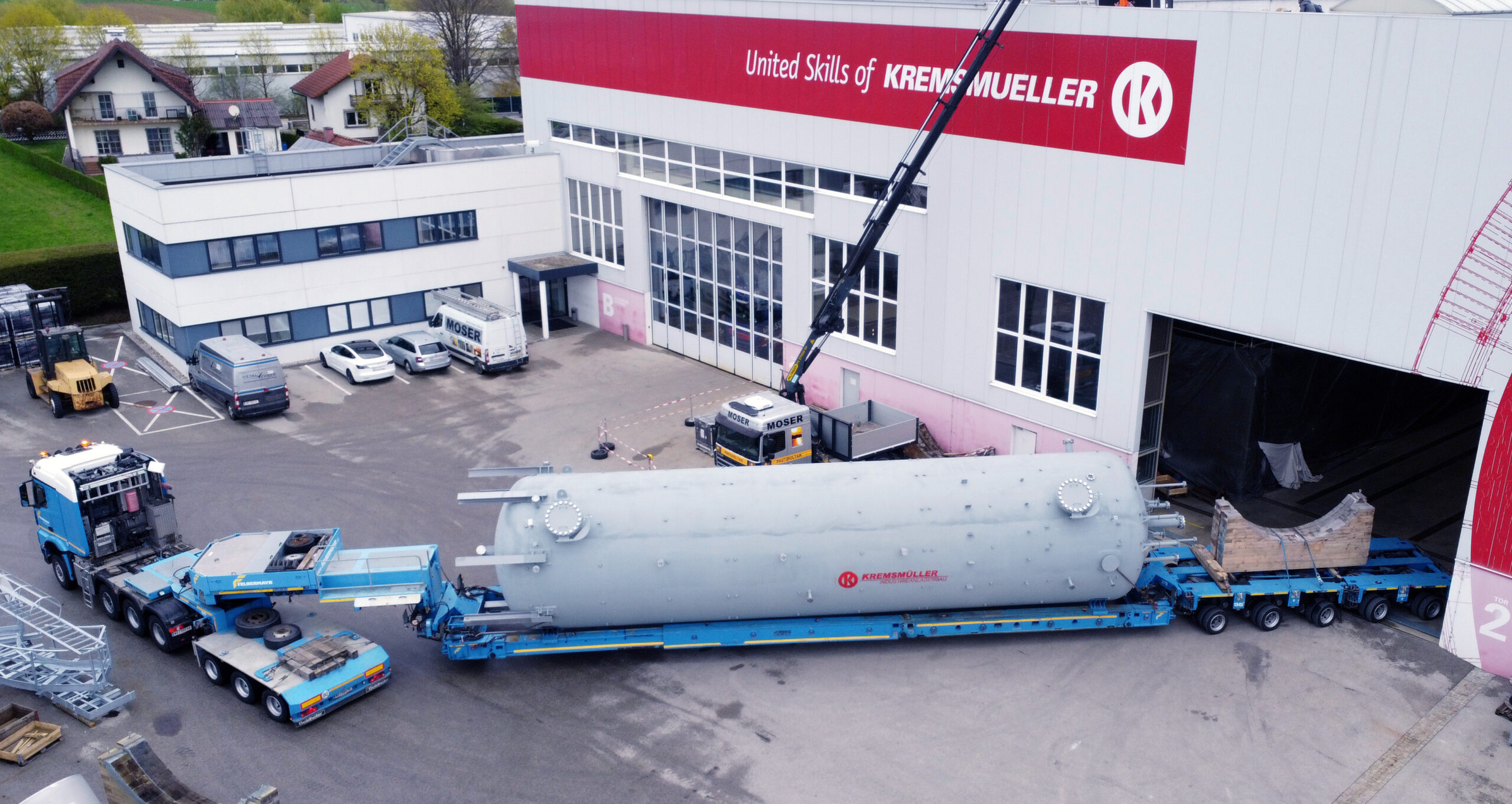 Kremsmüller lieferte für die Papierfabrik Mondi Neusiedler GmbH einen werksgefertigten 54 Tonnen schweren Dampfspeicher mit 4 Metern Durchmesser, einer Gesamthöhe